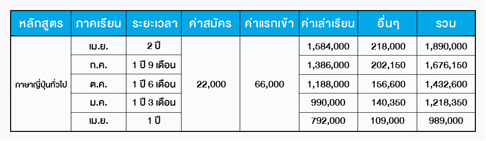 *หลักสูตรภาษาญี่ปุ่นทั่วไป 1-2 ปี ครั้งแรกชำระค่าแรกเข้า ค่าเล่าเรียน 6 เดือน และค่าอื่น ๆ รวม 571,000 เยน