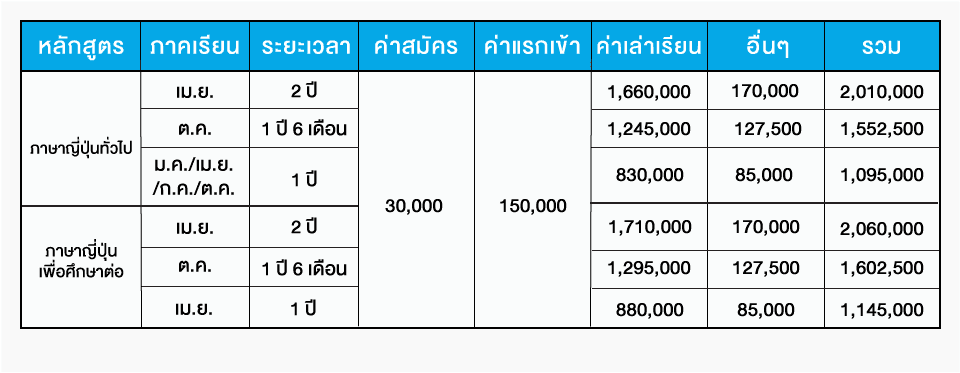 ครั้งแรกชำระค่าแรกเข้าและค่าเล่าเรียน 6 เดือน รวม 548,900 เยน (ยังไม่รวมค่าเรียนวิชา EJU)