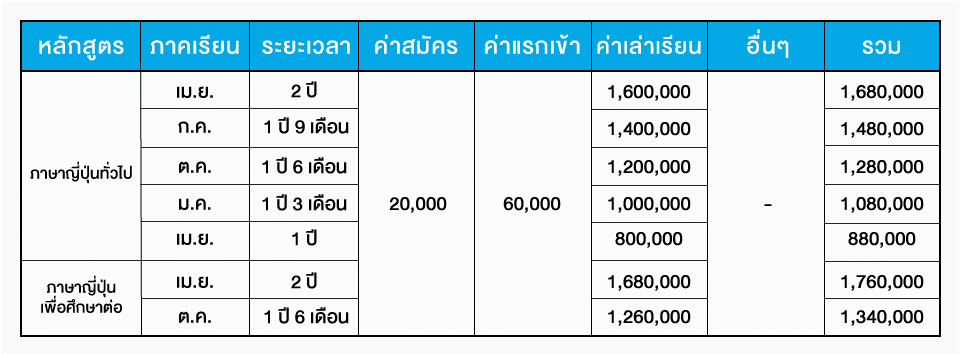 *หลักสูตรภาษาญี่ปุ่นทั่วไป ครั้งแรกชำระค่าแรกเข้า และค่าเล่าเรียน 6 เดือน รวม 460,000 เยน