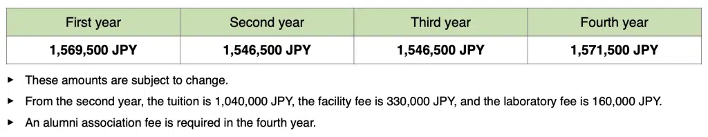 ค่าแรกเข้า 130,000 เยน ค่าเล่าเรียน 630,000 เยน (แบ่งจ่าย 2 ครั้ง) ค่าประกันและค่าสมาคมนักเรียน 49,500 เยน รวม 809,500 เยน |