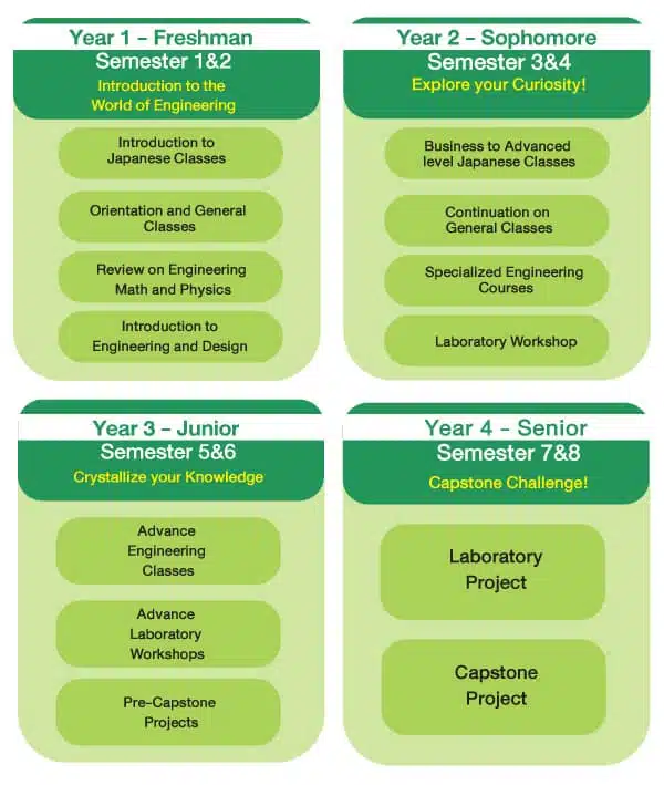 ในปีแรกและปีที่สอง นักศึกษาจะได้เรียนรู้เนื้อหาทางด้านวิศวกรรมทั้ง 13 ด้าน พร้อมกับลองลงมือปฏิบัติจริง เพื่อค้นหาเส้นทางที่เหมาะสมกับตัวเองมากที่สุด ก่อนที่จะเจาะลึกลงในสาขานั้นๆ และทำโปรเจคในปีสุดท้าย